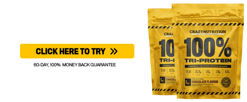 Crazynutrition’s Tri-Protein powder is the perfect addition to your lunchtime meal. It’s ideal for increasing gains, promoting muscle growth, boosting energy, and satisfying hunger with 21 grams of 3 different protein sources.