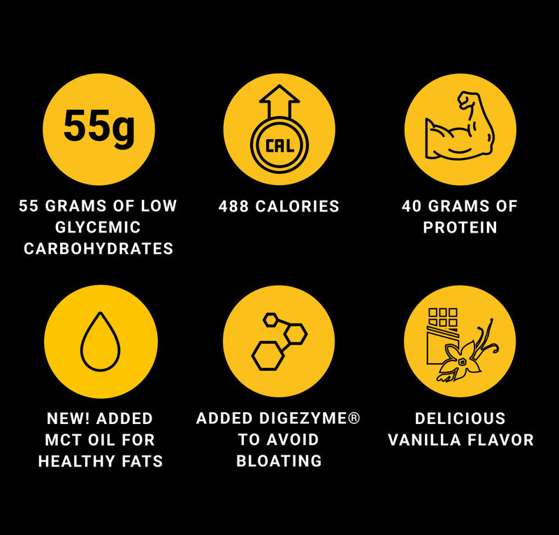 Ingredients: Oat Flour (Gluten Free), Whey Protein Concentrate (Milk), Bulking Agent (Maltodextrin), Milk Protein Concentrate (Milk), MCT oil powder (Milk), Flavours (Vanilla), Magnesium Oxide, Sweetener (Sucralose), Zinc Oxide, Colour (Beta Carotene), Pyridoxine HCL, Black Pepper Extract (95% Piperine), Digezyme® Enzyme Complex (Amylase, Protease, Cellulase, Lactase, Lipase), Methylcobalamin.